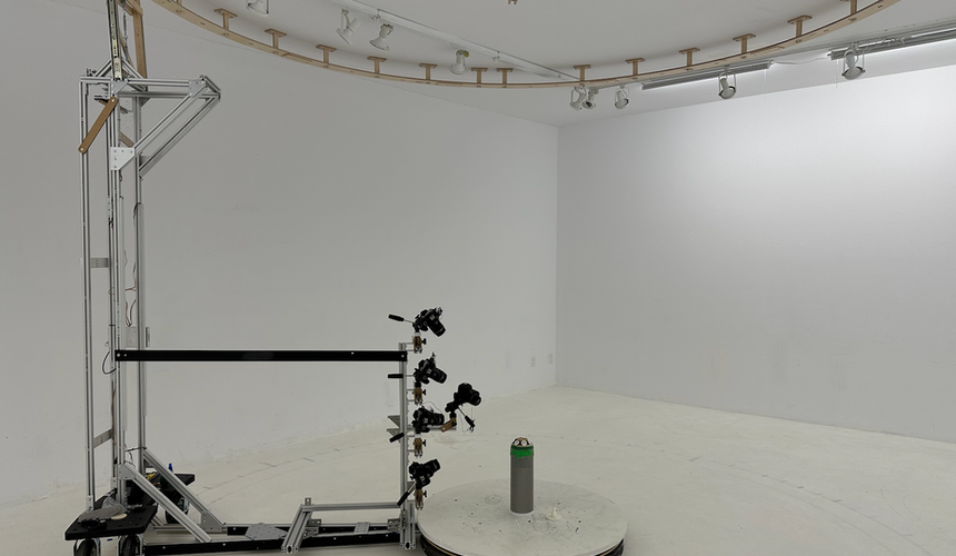 Pendant la pandémie, l’ingénieux Carl-Dave a patenté (vraiment!) une structure sur rails et roulettes sur laquelle sont arrimés cinq appareils photos, leur objectif dirigé vers l’objet installé au centre de la pièce. Ces appareils sont déclenchés à distance simultanément par l’utilisateur, après chaque déplacement manuel de la structure, et ce 96 fois pour revenir au point de départ. Pendant ce trajet circulaire seront amassées 490 photos.